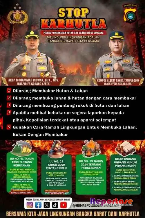 Reportase.com, Polres Bangka Barat mengajak masyarakat untuk menghentikan praktik pembakaran hutan dan lahan (karhutla) yang berpotensi merusak lingkungan serta berdampak hukum.Minggu 19 April 2026