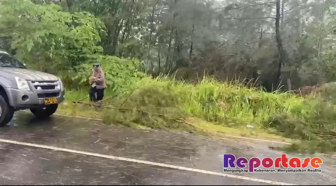 Reportase.com, Bangka — Hujan deras disertai angin kencang menyebabkan sebuah pohon tumbang di ruas Jalan Lintas Timur, Kecamatan Merawang, Kabupaten Bangka, yang sempat mengganggu arus lalu lintas, Sabtu (25/4/2026).